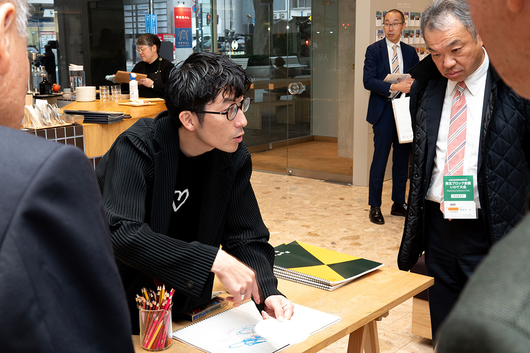 花巻市を出発後、次の見学施設である「株式会社へラルボニー」初の旗艦店である「HERALBONY ISAI PARK」へ向かいました。株式会社へラルボニー代表取締役Co-CEO松田文登様より施設のご案内をして頂きました。契約作家小林覚氏のデザインを採用した、岩手の新米「白銀のひかり」のロゴマークの思いや、岩手を本社にしている意義などをご説明いただきました。