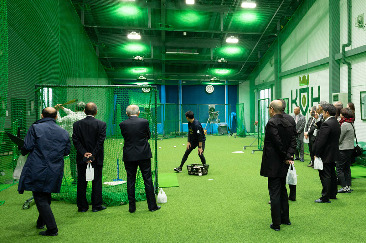 広報の山田理様より施設のご案内、菊池選手のK.O.Hに対する思い等、詳しく、熱く、ご説明をいただき、有名メジャーリーガーのサインボール、菊池選手が実際に使用していた野球道具の展示などを見学、メジャーリーグ水準の世界最先端のトレーニング機器を体験させていただきました。見学後隣接する日居城野運動公園敷地内の花巻ゆかりのメジャーリーガー記念モニュメントを見学、グラウンドでは来年の選抜大会出場を決めた花巻東高校野球部が練習を行っており、各県の参加者のみなさんも、興味深々のご様子で見学していました。